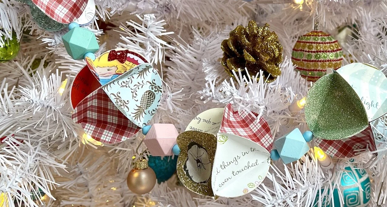 Last year’s “Vintage Greeting Card Christmas Ball Ornaments” were the inspiration for these garlands. Those 4” ornaments which took me weeks to complete looked fabulous on our tree, but I wasn’t satisfied. The tree still needed something. Christmas trees are always a work in progress at our house and some trees are never finished.